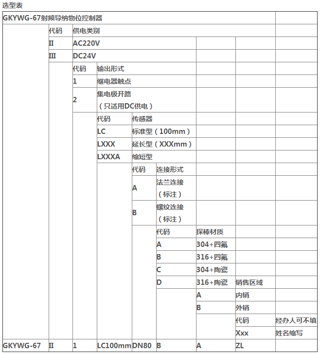 實(shí)例:GKYWG-67 II1 LC100mmBAZL , II代表繼電器觸點(diǎn),1代表繼電器輸出,LC100mm代表標(biāo)準(zhǔn)型,DN80代表法蘭尺寸。B代表316+四氟,A代表內(nèi)銷(xiāo)ZL代表銷(xiāo)售人員為張亮。